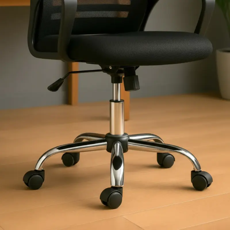 Incluye un sistema de ajuste de altura mediante pistón hidráulico que permite adaptar la silla a diferentes tipos de escritorio y usuarios. Su base cromada de cinco ruedas giratorias proporciona estabilidad y movilidad suave en distintos tipos de superficie, facilitando el desplazamiento sin esfuerzo dentro de tu área de trabajo.